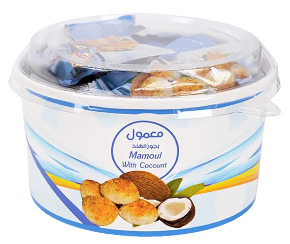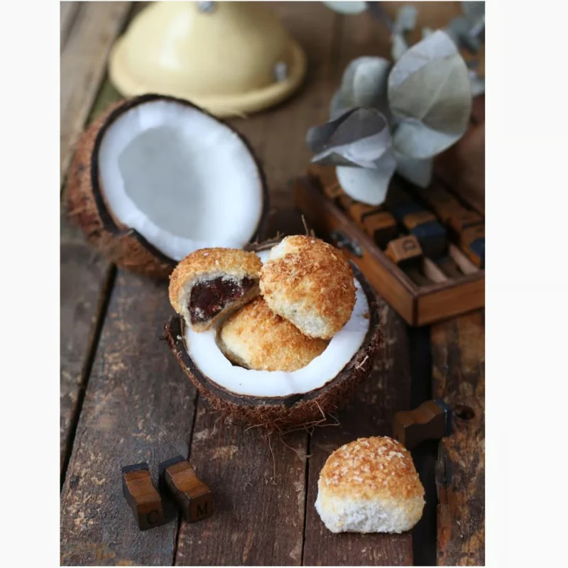 دقيق - عجينة تمر - سكر - زيت نباتي (نخيل) بيكنج بودر - مصل الحليب بودر جلوكوز - جوز هند مبشور - جليسرين - مواد رافعة ( بيكربونات الصوديوم) بيكنج . بودر - حمض الستريك (اي 330) - ملح طعام - مواد استحلاب (ليسيثين الصويا(إي322) - نكهة إصطناعية (جوز الهند